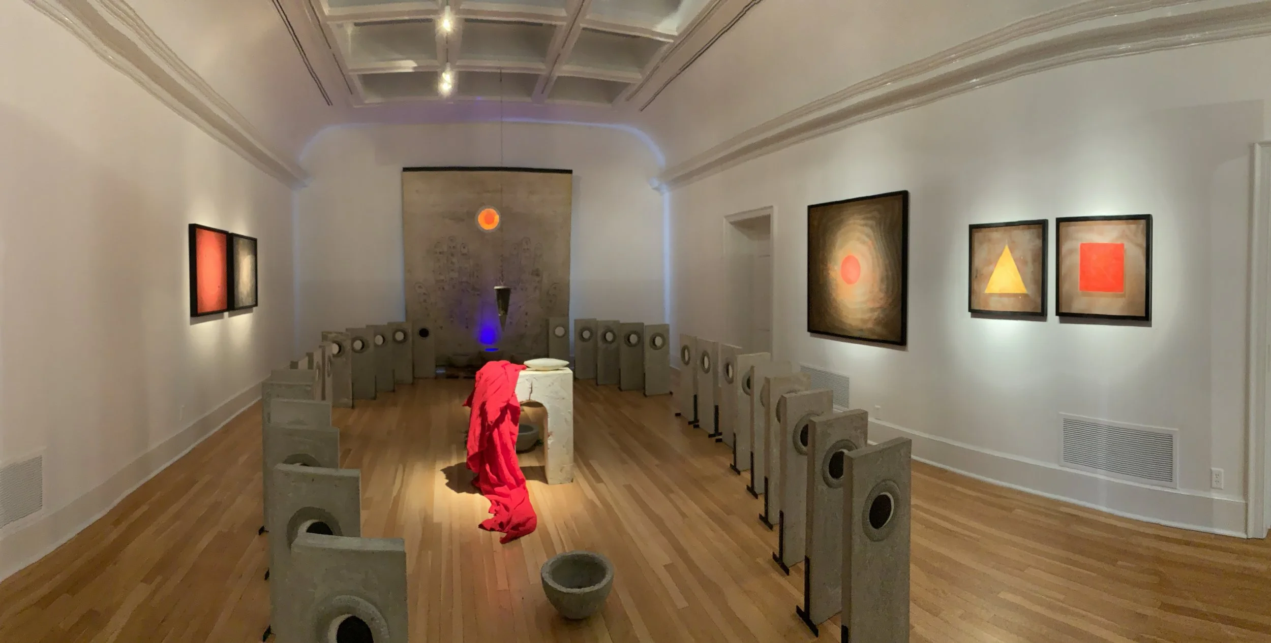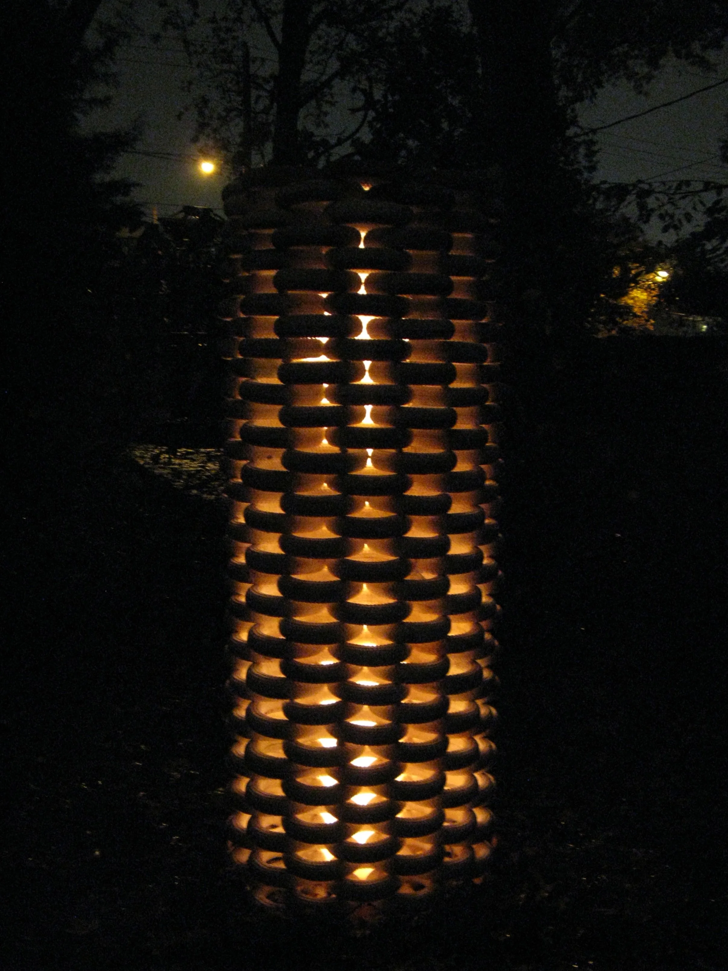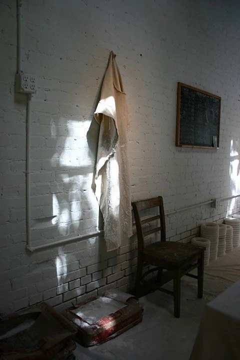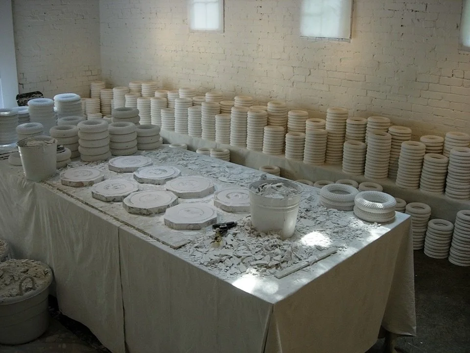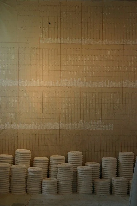 The Wreathmaker was a site specific installation at Whitespace Gallery in Atlanta. It consisted of 3000+ Plaster funerary wreaths stacked around the room, a table and molds and everything necessary for creating more wreaths on-site. On the wall at the back of the space was a large canvas “calendar” which began in March of 2003, the beginning of the Iraq War and was filled daily with white dots representing the number of wreaths / casualties of the day.