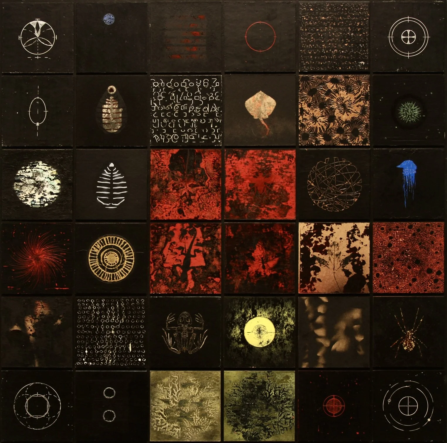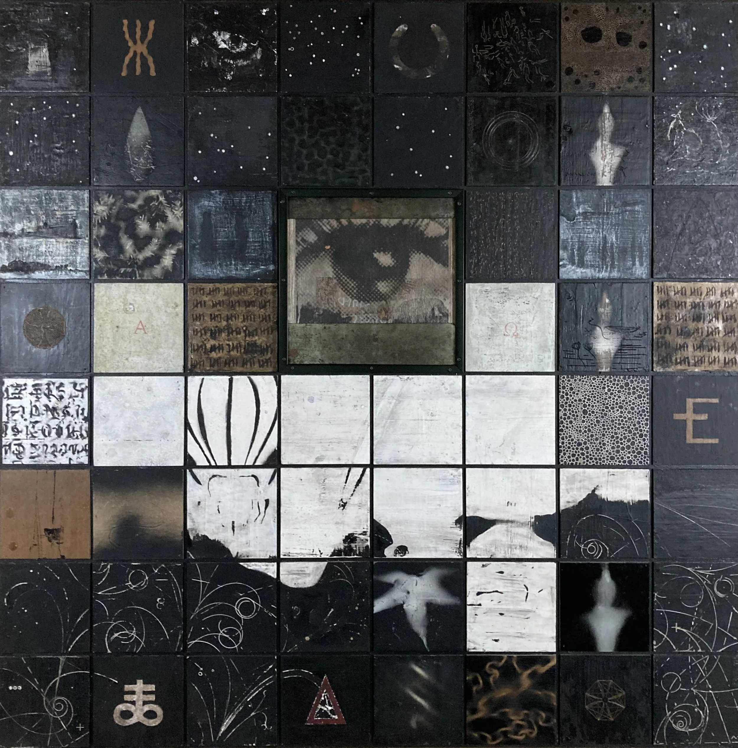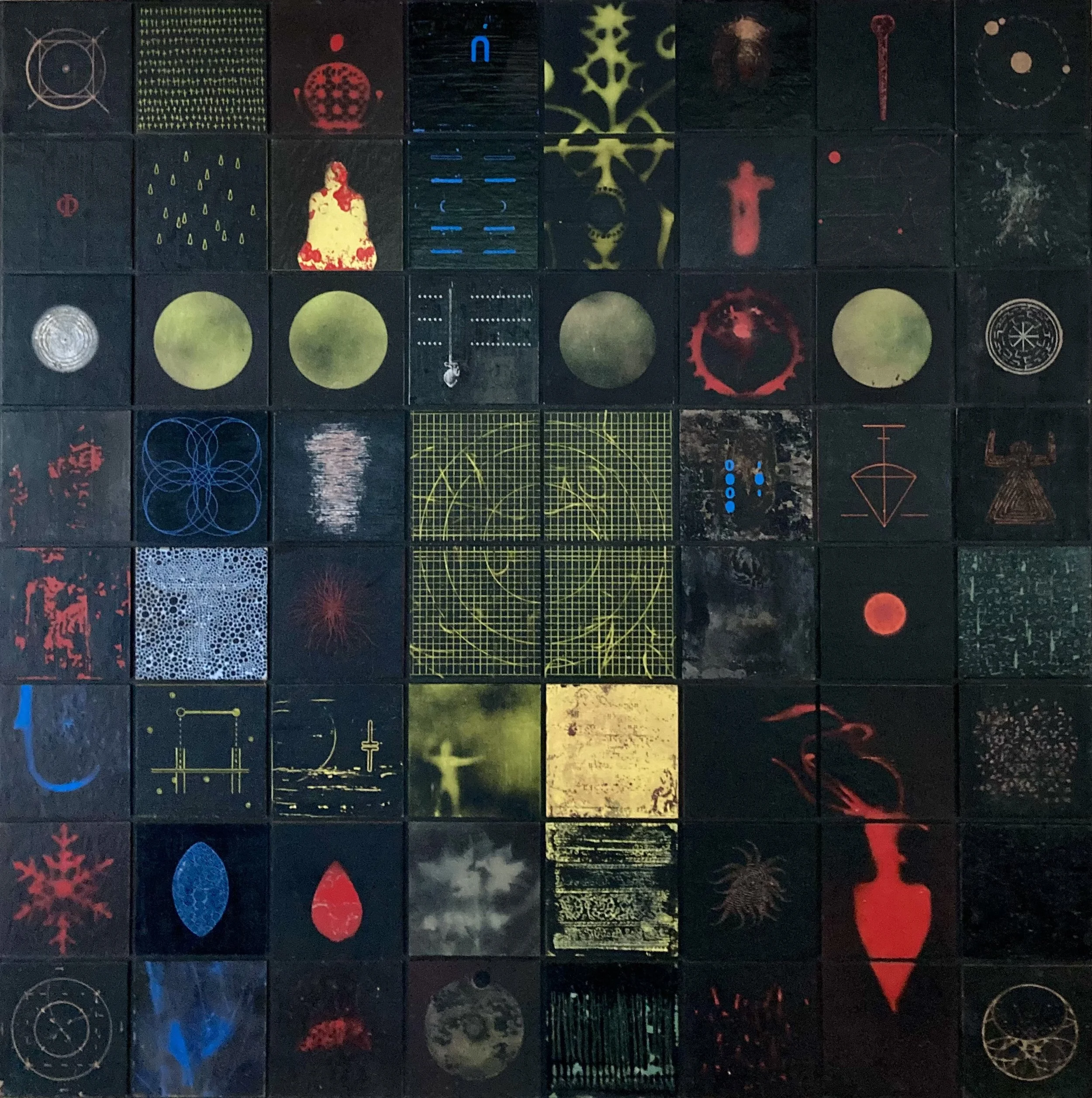 all are encaustic, oil, spray paint, etched, painted, and attached to a framed wood panel
